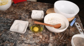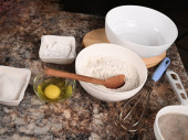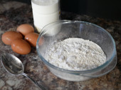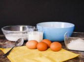 mąka, jajka, mleko. Składniki do pieczenia. Łyżka na marmurowym stole. Przygotowanie do gotowania