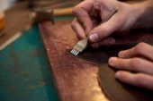 Zdjęcie "Rzemieślnik pracuje z młotkiem i awl do wybijania małych dziur na prawdziwej skórze na szew. Zbliżenie rzemieślnika pracującego z naturalną skórą przy użyciu narzędzi rzemieślniczych." może być wykorzystywane do celów osobistych i komercyjnych zgodnie z warunkami zakupionej licencji Royalty-free. Obraz jest dostępny do pobrania w jakości wysokiej rozdzielczości do 5760x3840.