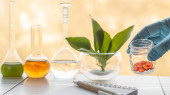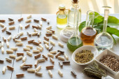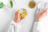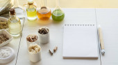 Suplement diety kapsułki i składniki. Ręka farmaceuty pisze w notatniku.