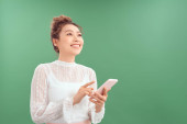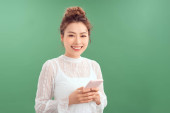 Szczęśliwa młoda Azjatka za pomocą smartfona, stojąc nad zielonym tle.