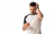mężczyzna w masce medycznej patrząc na pusty koszyk na białym