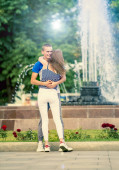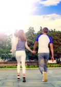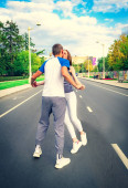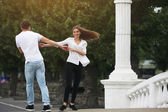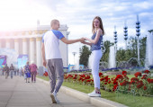 Szczęśliwe romantyczne chwile uroczej pary tańczącej i zabawiającej się w parku podczas randek. Para miłość odpoczynku lub relaksu w zielonym parku, taniec akcji w Walentynki podczas zachodu słońca