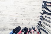 Narzędzia ustawione na drewnianym stole. śrubokręt i klucz. Koncepcja oprzyrządowania technicznego.