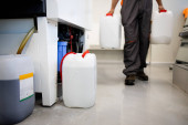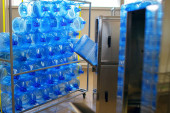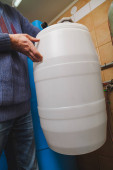 Czysta woda, męski ładowarka nosi duże butelki czystej wody pitnej, zbliżenie rąk pracowników, dostawa wody do domu, silne ręce, proces pracy