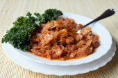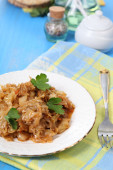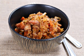 Bigos, tradycyjne polskie danie, kapusta i gulasz mięsny, płytkie skupienie