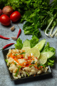 Sałatka azjatycka - drobno posiekana marchewka, kapusta i papryka z musztardowym sosem miodowym i kurczakiem wokowym w sosie teriyaki w czarnym talerzu na drewnianym tle. Zamknij drzwi. Żywność uliczna