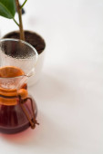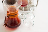 Białe tło, kieliszki do wina i czarna, mocna, poranna, świeża kawa w szklanym pojemniku do alternatywnego przygotowania metody.