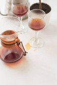 Białe tło, kieliszki do wina i czarna, mocna, poranna, świeża kawa w szklanym pojemniku do alternatywnego przygotowania metody.