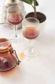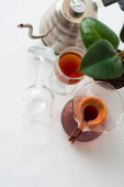 Białe tło, kieliszki do wina i czarna, mocna, poranna, świeża kawa w szklanym pojemniku do alternatywnego przygotowania metody.