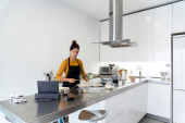 Zdjęcie "Brunetka kobieta myje ręce po gotowaniu w kuchni" może być wykorzystywane do celów osobistych i komercyjnych zgodnie z warunkami zakupionej licencji Royalty-free. Obraz jest dostępny do pobrania w jakości wysokiej rozdzielczości do 5760x3840.