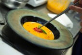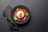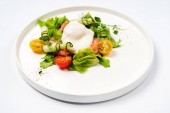 pyszne danie restauracji buratta z warzywami i ziołami na czarnym talerzu