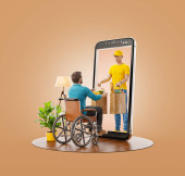 Niezwykłe 3D ilustracja młodego niepełnosprawnego człowieka siedzącego na wózku inwalidzkim otrzymującego rozkaz od kuriera. Usługa dostarczania żywności Aplikacja inteligentnego telefonu.