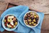 Świeże włoskie ciabatta z oliwą z oliwek na drewnianej desce z oliwkami, ziołami. Widok z góry, płaski