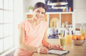 piękna młoda kobieta za pomocą tabletu cyfrowego w kuchni