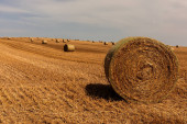 Zbliżenie beli siana na polu, podczas złotej godziny, ze wzgórzami w tle