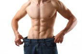 Waga losee koncepcja pokazuje umięśniony młody mężczyzna gospodarstwa gospodarstwa umieścić worgy ubrania i dając kciuki w górę