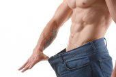Masa losee koncepcja pokazuje umięśniony młody mężczyzna gospodarstwa umieścić worgy ubrania