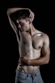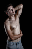 Koncepcja losee wagi pokazująca umięśnionego młodego dorosłego mężczyznę w dresie i trzymającego wagę łazienkową