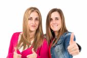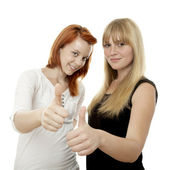Młoda atrakcyjna dziewczyna z kciuki do góry na białym tle
