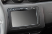 Piękne koło kierownicy, kolumna kierownicy i panel sterowania, deska rozdzielcza w czarnym, mocnym i mocnym samochodzie, SUV