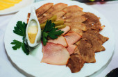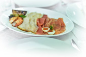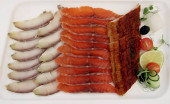 Piękne i smaczne świeże danie z ryb, łososia i owoców morza, skorupiaków, przystawki, kanapki lub kanapki.