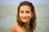 uśmiechnięta blondynka szuka koryta teleskop z zaskoczony twarz