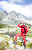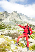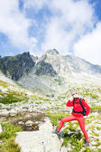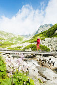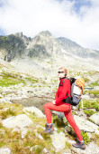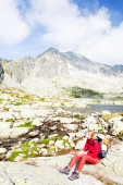 backpacker kobieta w pięciu stawach spiski, vysoke tatry (Wysokie Tatry),