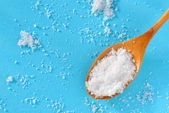 Skrobia kukurydziana jest wylewana ze szklanego słoika na drewniany stół, przestrzeń do kopiowania.