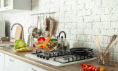 Zdjęcie "Nowoczesne stylowe skandynawskie wnętrze kuchni z akcesoriami kuchennymi. Jasnobiała kuchnia z artykułami gospodarstwa domowego ." może być wykorzystywane do celów osobistych i komercyjnych zgodnie z warunkami zakupionej licencji Royalty-free. Obraz jest dostępny do pobrania w jakości wysokiej rozdzielczości do 5760x3840.