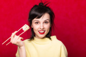 Kobieta z czerwonymi ustami na jasnym tle jedząca sushi. azjatycka żywność