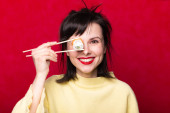 Kobieta jedząca sushi i bułki na czerwonym tle