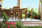 Krzesła ze stołem do jedzenia ludzi biznes tło morze na letnie wakacje.