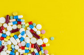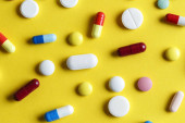 pigułki na kolorowym tle widok z góry. Medycyna, leczenie, choroba. Leki w tabletkach.