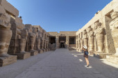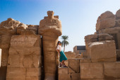 Atrakcyjne brunetka dziewczyna w białej sukience spacery wśród starożytnych ruin świątyni Karnak w Luksorze. Stany Zjednoczone