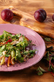 sałatka sandaczowa z warzywami w talerzu na drewnianym stole. cytryna dla ryb i piwa obiad widok z góry