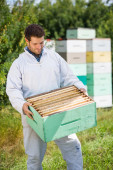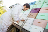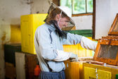 Pszczelarz z pracy w fabryce skrzynie o strukturze plastra miodu