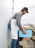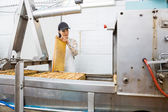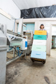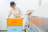 Pszczelarz pracy w zakładach ekstrakcji miodu w fabryce