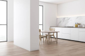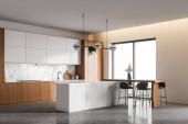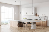 Zdjęcie "Narożnik nowoczesnej kuchni z biało-niebieskimi ścianami, drewniana podłoga, białe blaty z wbudowaną kuchenką i umywalką oraz marmurowy i niebieski bar ze stołkami. Okno z zamazanym tropikalnym widokiem. 3d renderowanie" może być wykorzystywane do celów osobistych i komercyjnych zgodnie z warunkami zakupionej licencji Royalty-free. Obraz jest dostępny do pobrania w jakości wysokiej rozdzielczości do 5760x3840.