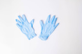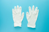 Nowe czyste medyczne rękawice gumowe do ochrony dłoni przed zarazkami izolowanymi na jasnoniebieskim tle