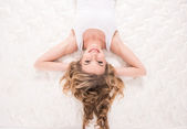 Widok z góry obraz ciężarnej kobiety trzymającej, dotykającej brzucha podczas siedzenia na łóżku w domu. Pojęcie macierzyństwa, ciąży, nowego życia i planowania rodziny