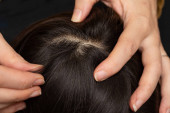 Seksowna młoda biała dziewczyna jest widziana z tyłu za pomocą palców do zabawy długimi brązowymi włosami. Wyciągając go, aby stworzyć styl Bob z tyłu głowy.