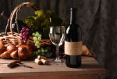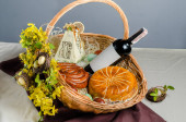 Kosz z ciastem, kiełbasą, winem, ciastem wielkanocnym, bułką z makiem, jajkami
