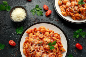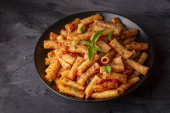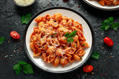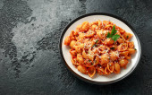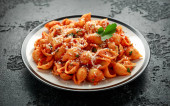 Conchiglie rigate makaron z ciecierzycy w sosie pomidorowym z serem parmezanu. Zdrowe wegańskie jedzenie.