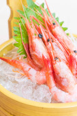 Zbliżenie pyszne krewetki na makaron ryżowy w białym dysku umieszczanie razem z różnych składników jako tło