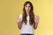 Zdjęcie "Ludzie, emocje i koncepcja stylu życia. Powiedz, żebyś przestał. Poważny młody surowy azjatycki kobieta korepetytor, nauczyciel lub pracownik podniesienie ręki w odrzuceniu, dezaprobata i ostrzeżenie, zakazać działania" może być wykorzystywane do celów osobistych i komercyjnych zgodnie z warunkami zakupionej licencji Royalty-free. Obraz jest dostępny do pobrania w jakości wysokiej rozdzielczości do 5760x3840.