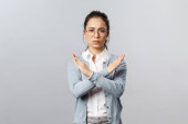 Ludzie, emocje i koncepcja stylu życia. Powiedz, żebyś przestał. Poważny młody surowy azjatycki kobieta korepetytor, nauczyciel lub pracownik podniesienie ręki w odrzuceniu, dezaprobata i ostrzeżenie, zakazać działania