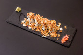 uramaki sushi rolki z serem śmietankowym, smażony łosoś, wióry tuńczyka, awokado w talerzu na czarnym drewnianym tle stołu