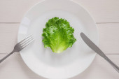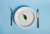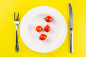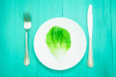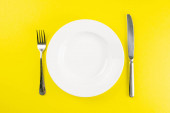 Świeże zielone liście szpinaku na białym talerzu widelec nóż na jasnożółtym tle płaski leżał top view kopiuj spację. Młode liście szpinaku, zdrowe jedzenie, dieta. Koncepcja kreatywnej żywności.