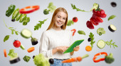 Zdrowa dieta. Wesoła dziewczyna jedząca sałatkę z miski, kolaż z warzywami w powietrzu, białe tło. Panorama