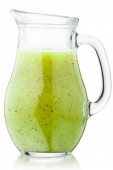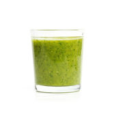 Zielony sos chili z limonką w przezroczystej szklanej sosie łodzi izolowane na białym tle